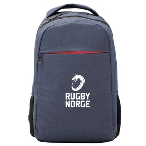 Praktisk ryggsekk med polstrede remmer og frontlomme. Stilige melangert farge i grå eller marineblå. Rugby Norge logo.