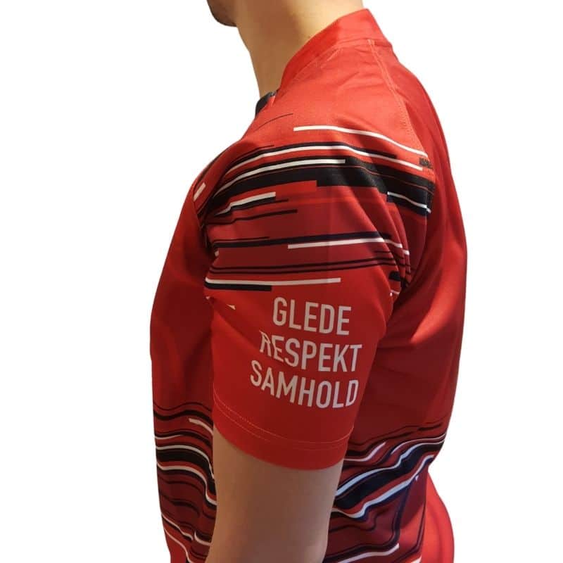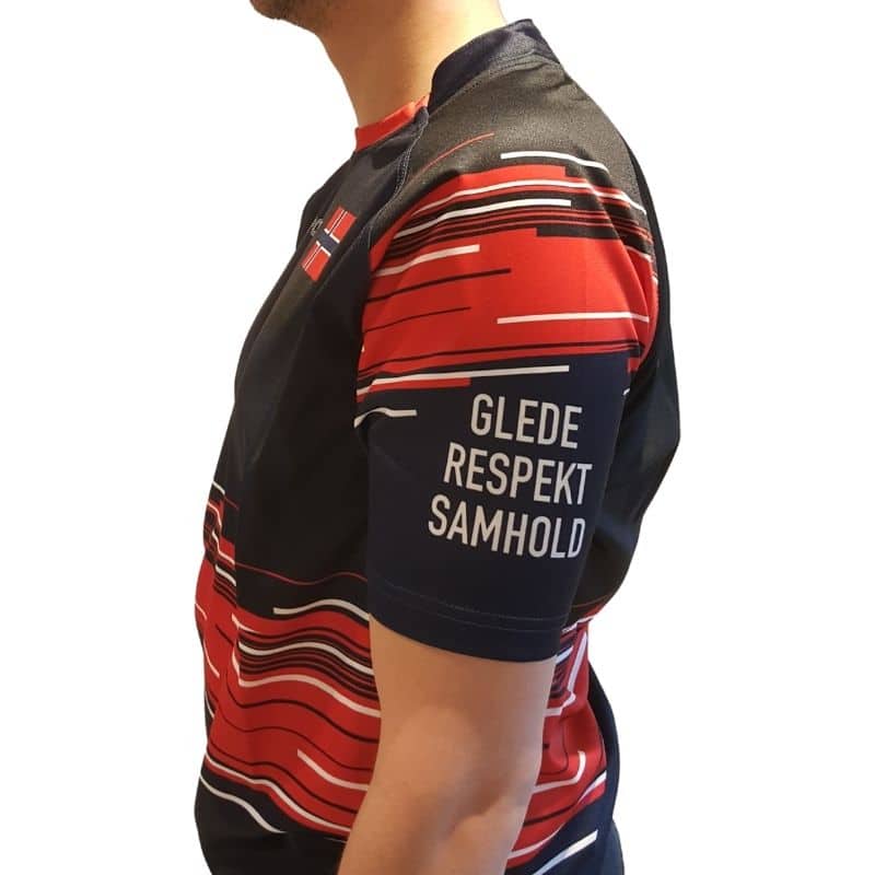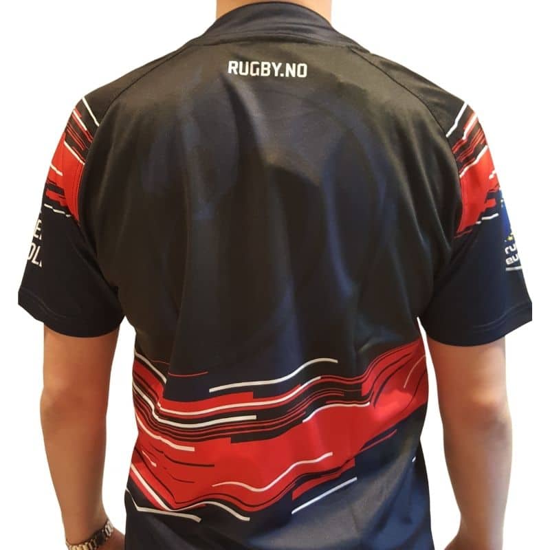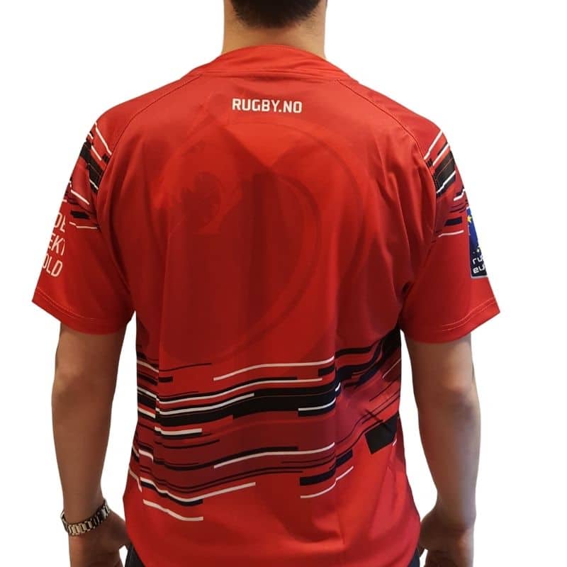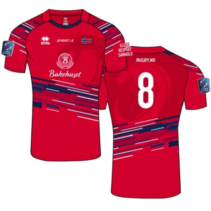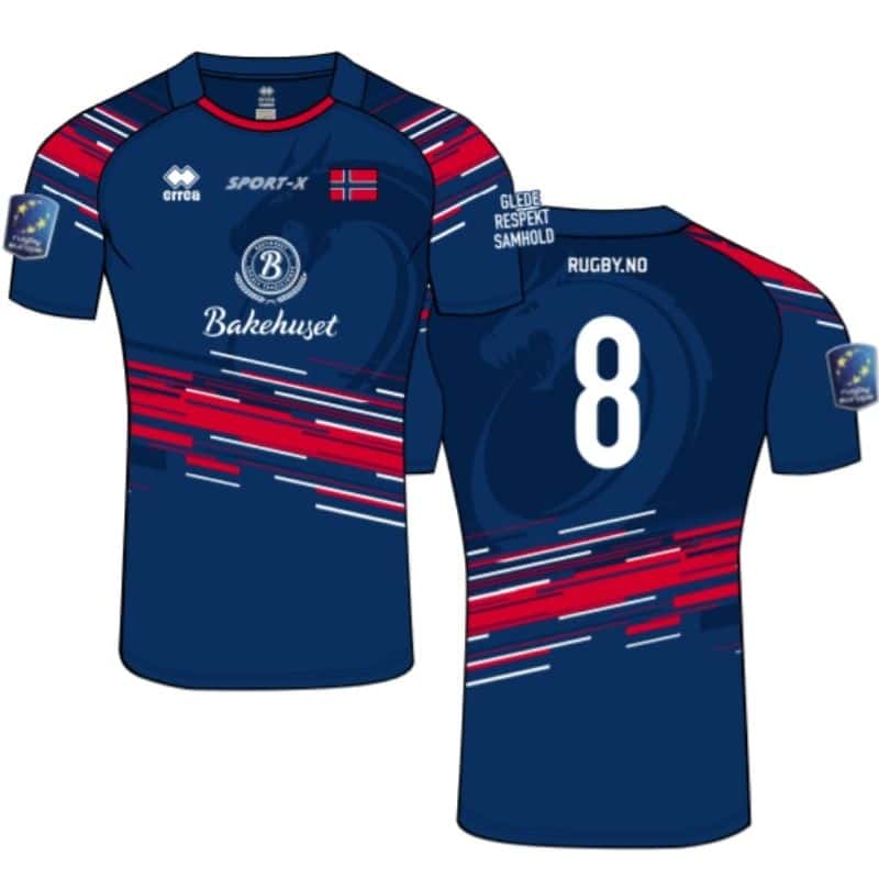 Official home- and away shirts of the Norwegian Rugby Internationals. Model with Bakehuset sponsor logo printed on the chest. Custom design by Italian teamwear manufacturer Erreá Sport.